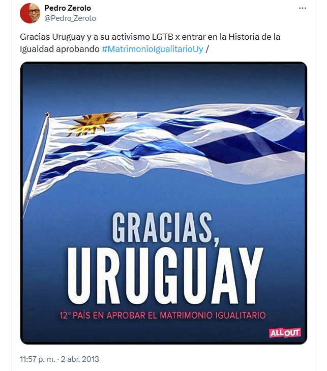 En 2013, Pedro Zerolo viajó a Uruguay para apoyar el debate parlamentario que terminaría con la aprobación del matrimonio igualitario en ese país. Acompañó, inspiró y animó a activistas y legisladores a dar un paso valiente hacia la igualdad. Su presencia no fue simbólica: fue política, emocional y profundamente transformadora.